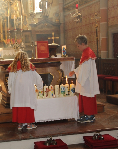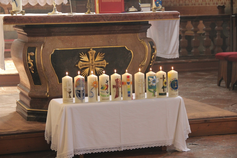 Liebevoll selbstgebastelte Kerzen aus allen Ortsteilen wurden geweiht und diese Kerzen brennen während des Jahres auf dem Altar.